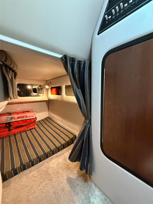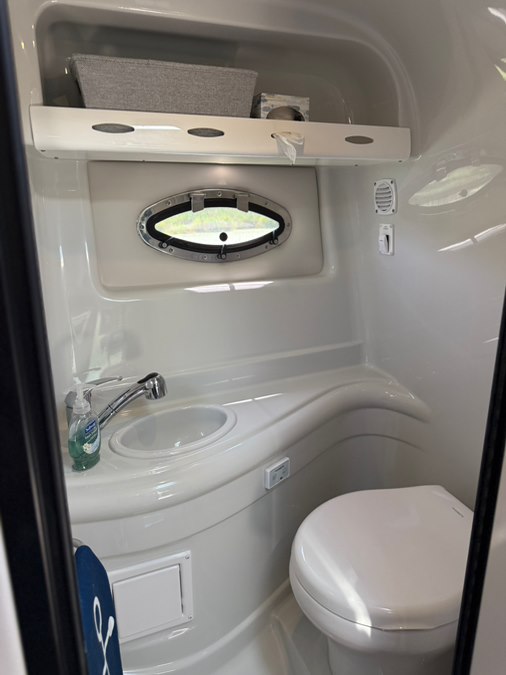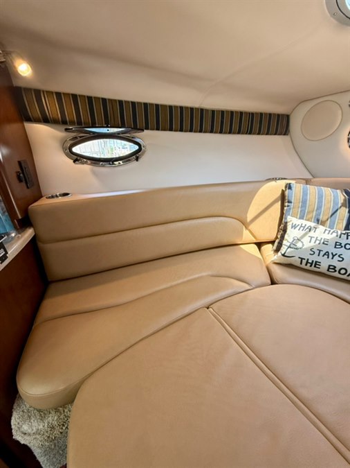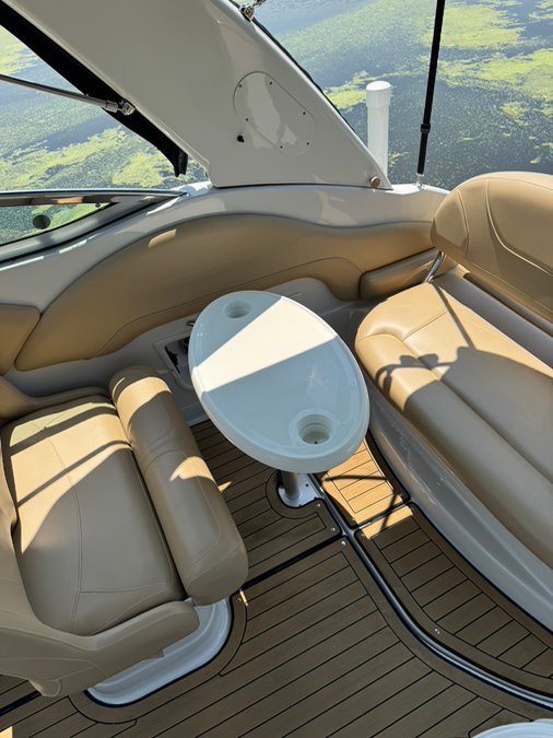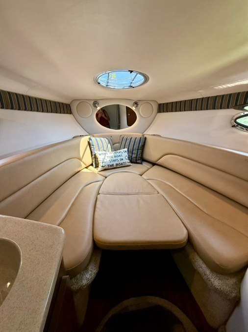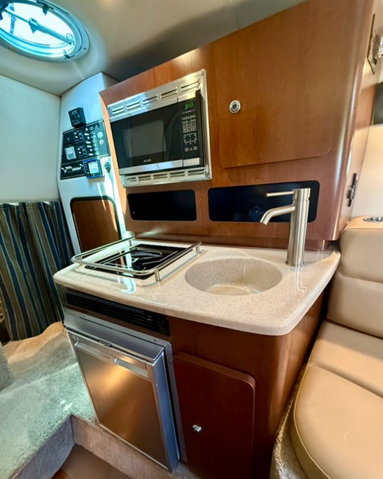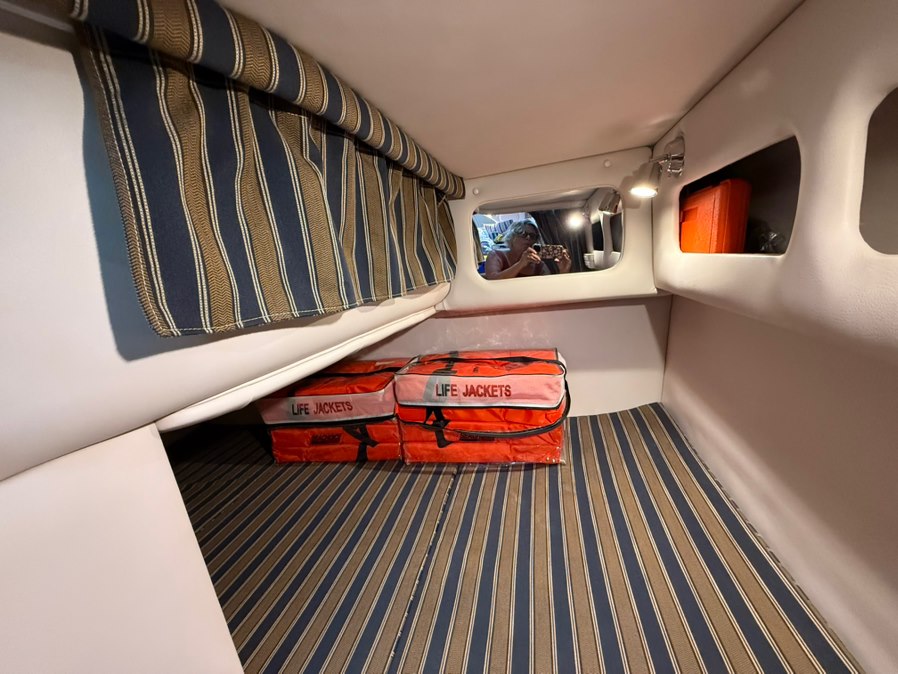 Step down cabin with Air Conditioning! Galley package including countertop with sink and stovetop, microwave, fridge, and wood cabinets. Wood flooring, salon seating area with throw pillows, and an aft cabin sleeper. Enclosed head with sink/shower and a pump out potty.