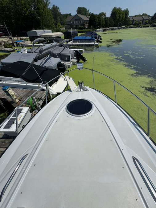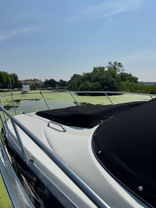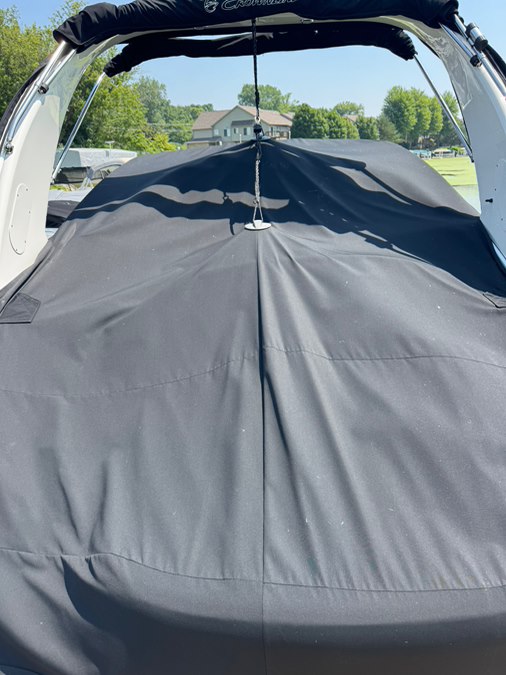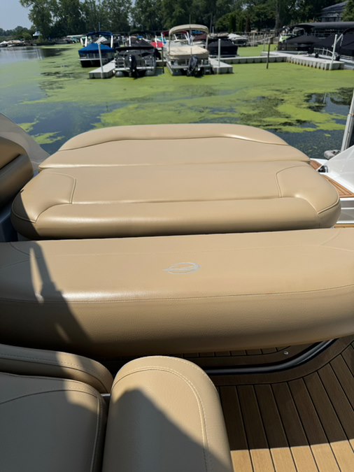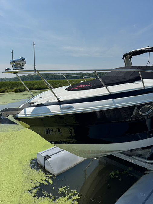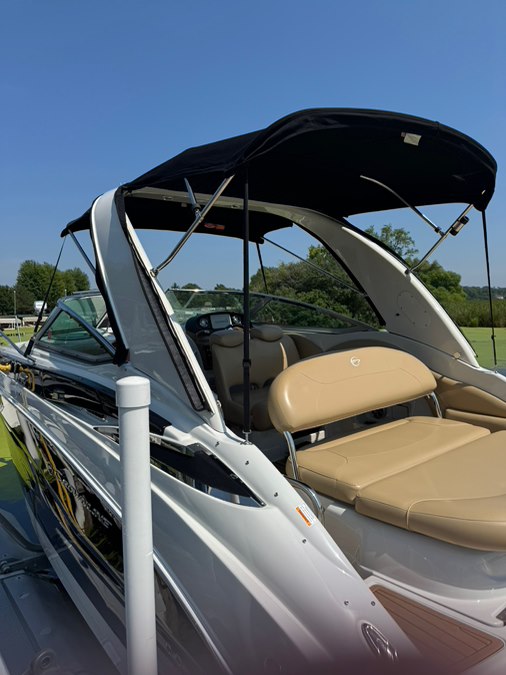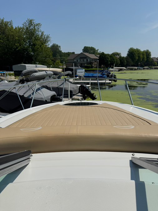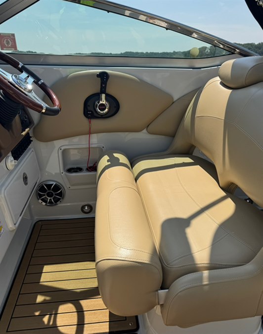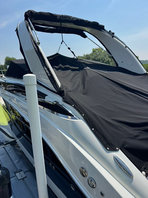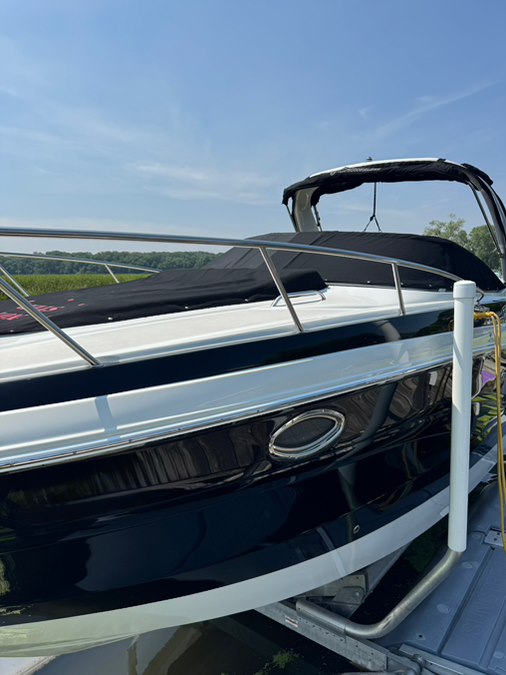 Stainless rubrail, deck rails, and features an extended fiberglass swim platform with drop down swim ladder. Stainless ski tow eye, pop up cleats, and 4x quick release fender mounts.